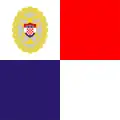 | Design | Three equal horizontal bands of red (top), white and blue superimposed by the Coat of arms of Croatia. |