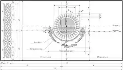 | Design | A gold sun with 32 rays above a soaring golden steppe eagle, both centred on a turquoise field. The hoist side displays a national ornamental pattern "qoşqar-müiız" |