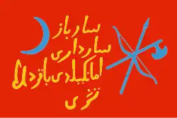 In 1916, Russia required Muslim people of Central Asia to join Russian military forces. Russian colonial regime and economic instability led to the Central Asian Revolt of 1916. Amongst Kazakhs, Amankeldy Imanov was a leading figure in the revolts. He and his associates used a red flag with yellow text; blue half-moon in the top-left; blue bow, spear and an axe crossed on red background.