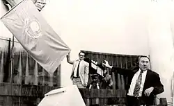 Alash state again lacked one agreed flag, however the Autonomy had their proposed flags. Alikhan Bukeikhanov and Barlybek Syrtanov proposed the flag with green, yellow, red stripes and white crescent with yellow star in top-left in the draft constitution of the "Country of the Kazakhs" (1911), however, there is not a single historical confirmation of the use of this flag by the Alash Orda (1917–1920).[3] The direction of stripes is not mentioned. Sometimes people use the logo of Kazak, the journal published by members of Alash, as a flag of the Autonomy. This variant of flag depicts a yellow yurt on a white background, this flag is mentioned in the "Will of the People" newspaper as approved on 6 June 1918.[4]