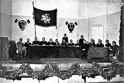 Debates about the national flag occurred again in 1917 during the Vilnius Conference. Two colours, green and red, were chosen based on their prevalence in folk art. Artist Antanas Žmuidzinavičius decorated the conference hall with small red and green flags. However, the delegates did not like the design as it was too dark and gloomy.[3] Then Tadas Daugirdas suggested adding a narrow strip of yellow (to symbolise the rising sun) in between the red (clouds lit up by the morning sun) and green (fields and forests).[4] However, the delegates decided that the matter should be settled by a special commission, composed of Basanavičius, Žmuidzinavičius, and Daugirdas. On 19 April 1918, they submitted their final protocol to the Council of Lithuania. The flag was supposed to be a tricolour (yellow at the top, green in the middle, and red at the bottom) with Vytis in the upper left corner or in the middle.[3] The Council accepted the proposal, but the 1922 Constitution of Lithuania did not include any mention of the coat of arms. It adopted the national flag that is used today. Any of the debates failed to produce a historical flag.[3] Discussions of the national flag continued; its opponents considered gold an inappropriate colour, since the combination of yellow, green, and red did not follow the existing rules of heraldry. However, no changes were made during the Interwar period.