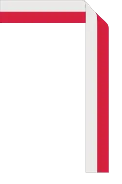 According to Chapter I, Article 28, paragraph 2 of the Constitution, the national colours of Poland are white and red.[1] The Coat of Arms Act, Article 4, further specifies that the colours are white and red in two horizontal, parallel stripes of equal width, of which the top one is white and the bottom one is red.[2] If the colours are displayed vertically, the white stripe is placed on the left from the onlooker's viewpoint. Attachment no. 2 to the Act shows the national colours in both horizontal and vertical alignment, as well as the official shades of both colours expressed as coordinates in the CIE xyY (CIE 1931) colour space with the tolerated colour differences (ΔE) specified in the CIE 1976 (L*, u*, v*) colour space (CIELUV).[2]