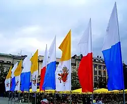 The flag is often popularly flown during important sporting events, such as the FIFA World Cup, if Polish athletes are participating;[10] and during an official visit of a particularly important person, especially a pope, in Poland. During a pope's visit, the national flag is usually flown together with yellow and white Church flags, and white and blue Marian flags.[11] It is uncommon to fly the national flag on personal occasions, such as birthdays or weddings.[3]