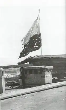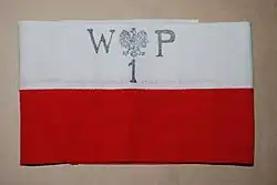 20th-century Polish insurgents wore white-and-red brassards (armbands) which played a role similar to the cockade of previous centuries. Such armbands were worn by Polish freedom fighters during the Greater Poland Uprising (1918–1919) and Silesian Uprisings (1919–1921), as well as during the Second World War (1939–1945) by the soldiers of the Home Army (AK) and Peasants' Battalions (BCh) – usually emblazoned with the acronyms of their formations.[13] During the Second World War, Polish soldiers raised the Polish flag on several sites of their victories. On 18 May 1944, after an Allied victory over the German forces in the Battle of Monte Cassino, a patrol of the 12th Podolian Uhlan Regiment (part of the Polish 3rd Carpathian Rifle Division) raised a Polish flag on ruins of the Monte Cassino abbey in Italy. On 1 August 1944, the first day of the Warsaw Uprising, a white-and-red flag was hoisted on the Prudential building, Warsaw's tallest skyscraper of the time. During the liberation of Warsaw by Soviet forces and Polish People's Army on 17 January 1945, Polish flags were raised on the Belvedere palace and ruins of the Main Railway Station. On 2 May 1945, after the capture of Berlin, soldiers of the 7th Battery, 3rd Division, 1st Light Artillery Regiment planted Polish flags on the Berlin Victory Column.[13]