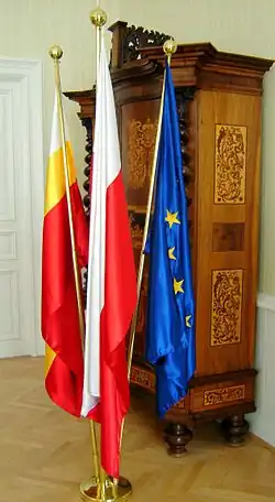 Today, many flags used in Poland are based on the design of the national flag. This applies especially to flags defined by Polish law and used by the Polish military and other uniformed services, such as the naval ensign – a swallow-tailed horizontal bicolour of white and red defaced with the arms of Poland in the white stripe.[22] Flags of some administrative subdivisions also resemble the national flag. Examples include the former flag of the Lower Silesian Voivodeship – a horizontal bicolour of white and red defaced with the arms of the voivodeship – or the flag of the Lesser Poland Voivodeship – a horizontal tricolour of white, yellow and red with the yellow stripe half as wide as any of the other two.[23]