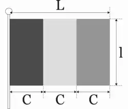 Law no. 75/1994[2] specifies that the flag height is 2/3 of the width and that the color stripes are of equal size with blue at the hoist.