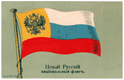 A variant of the flag was authorized for private use by Tsar Nicholas II before World War I, adding the large state eagle on a yellow field (imperial standard) in the canton. It has never been used as the official state flag. Likewise, today some Russian people may use another variant of the flag defaced with the coat of arms (in this case the double-headed eagle is depicted without the shield) in the middle and the golden word РОССИЯ at the bottom.[45]