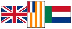Finally, a compromise was reached that resulted in the adoption of a separate flag for the Union in late 1927 and the design was first hoisted on 31 May 1928. The design was based on the so-called Van Riebeeck flag or "Prince's Flag" (Prinsenvlag in Afrikaans) that was originally the Dutch flag; it consisted of orange, white, and blue horizontal stripes. A version of this flag had been used as the flag of the Dutch East India Company (known as the VOC) at the Cape (with the VOC logo in the centre) from 1652 until 1795. The South African addition to the design was the inclusion of three smaller flags centred in the white stripe. The miniature flags were the British Union Flag (mirrored) towards the hoist, the flag of the Orange Free State hanging vertically in the middle and the Transvaal Vierkleur towards the fly. The position of each of the miniature flags is such that each has equal status. However, to ensure that the Dutch flag in the canton of the Orange Free State flag is placed nearest to the upper hoist of the main flag, the Free State flag must be reversed. The British Union Flag, which is nearest to the hoist and is thus in a more favoured position, is spread horizontally from the Free State flag towards the hoist and is thus also reversed. Although placed horizontally furthest from the hoist, to balance the British Union Flag, the Vierkleur is the only one of the miniature flags which is spread in the same direction as the main flag. This compensates for its otherwise less favourable position. In this arrangement, each of the miniature flags enjoy equal precedence.[12] Note that the miniature flags of the Transvaal Republic and the Orange Free State both contain miniature flags of the Netherlands, while the miniature flag of the United Kingdom is a composition of the flags of England, Scotland and the Anglo-Irish people, making the old South African flag the only former national flag in the world containing five flags within three flags within a flag.
