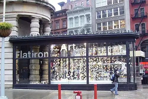 Buildings directly across the street from the Flatiron Building include the Toy Center to the north, the Sohmer Piano Building to the southwest, the Scribner Building to the south, and Madison Green to the southeast.[16] Entrances to the New York City Subway's 23rd Street station, served by the R and W trains, are adjacent to the building.[22] The Flatiron Building is within the Ladies' Mile Historic District,[23] a preservation which extends between 15th Street (to the south) and 24th Street (to the north).[24][25]