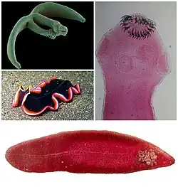 | In a clockwise spiral, starting from top left: Eudiplozoon nipponicum (monogeneans), pork tapeworm (tapeworms), common liver fluke (trematodes), Pseudobiceros hancockanus (Turbellaria) | |