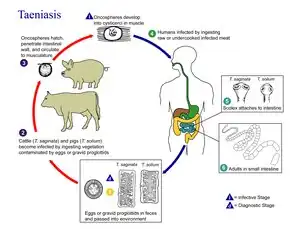 - Various species of Taenia infest the guts of humans, cats and dogs. The juveniles use herbivores – such as pigs, cattle and rabbits – as intermediate hosts. Excreted proglottids release eggs that stick to grass leaves and hatch after being swallowed by a herbivore. The larva then makes its way to the herbivore's muscle tissue, where it metamorphoses into an oval worm about 10 millimetres (0.39 in) long, with a scolex that is kept internally. When the definitive host eats infested raw or undercooked meat from an intermediate host, the worm's scolex pops out and attaches itself to the gut, when the adult tapeworm develops.[14]