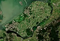 The province had a population of about 445,000[6] as of January 2023 and consists of six municipalities. Its capital is Lelystad and its most populous city is Almere, which forms part of the Randstad and has grown to become the seventh largest city of the country. Flevoland is bordered in the extreme north by Friesland, in the northeast by Overijssel, and in the northwest by the lakes Markermeer and IJsselmeer. In the southeast, the province borders on Gelderland; in the southwest on Utrecht and North Holland. Outside urban areas, the land in Flevoland is predominantly used for agriculture.