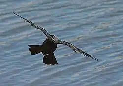 In general, juveniles have feathers which are narrower and more sharply pointed at the tip.[49][50] This can be particularly visible when the bird is in flight, especially in the case of raptors. The trailing edge of the wing of a juvenile bird can appear almost serrated, due to the feathers' sharp tips, while that of an older bird will be straighter-edged.[49] The flight feathers of a juvenile bird will also be uniform in length, since they all grew at the same time. Those of adults will be of various lengths and levels of wear, since each is moulted at a different time.[46]