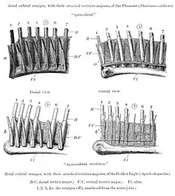 The outermost primaries—those connected to the phalanges—are sometimes known as pinions.