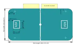 Floorball is played indoors on a rink whose size can officially vary from 18–20 m (59–66 ft) wide to 36–40 m (118–131 ft) long,[25] and which is surrounded by 50 cm (20 in) high enclosed boards with rounded corners. The goals are 160 cm (63 in) wide and 115 cm (45 in) high. Their depth is 65 cm (26 in) and they are 2.85 m (9 ft 4 in) from the end of the nearest boards. Face-off dots are marked on the center line. Dots are also marked 1.5 m (4 ft 11 in) from both sides of the rink on the goal lines imaginary extensions. The dots do not exceed 30 cm (12 in) in diameter. They do not have to be dots, they can also be crosses.[25]