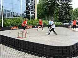 A simplified less formal version of floorball, played with smaller team numbers and shorter periods, and typically outdoors on various surfaces, including AstroTurf. In its most basic form, it is an informal pick up game amongst friends. However, a more formal version is played in Sweden, with the following structure:[35]