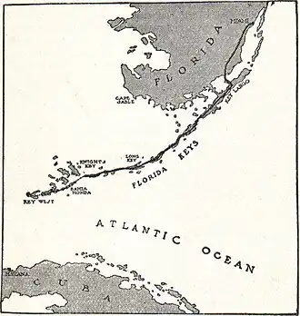 The Keys were originally inhabited by the Calusa and Tequesta people and were later charted by Juan Ponce de León in 1513. De León named the islands Los Martires ("The Martyrs"), as they looked like suffering men from a distance.[3] "Key" is derived from the Spanish word cayo, meaning small island. For many years, Key West was the largest town in Florida, and it grew prosperous on wrecking revenues. The isolated outpost was well located for trade with Cuba and the Bahamas and was on the main trade route from New Orleans. Improved navigation led to fewer shipwrecks, and Key West went into a decline in the late nineteenth century.