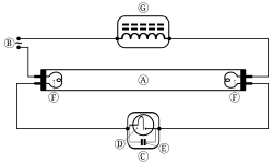 A preheat fluorescent lamp circuit using an automatic starting switch. A: Fluorescent tube, B: Power (+220 volts), C: Starter, D: Switch (bi-metallic thermostat), E: Capacitor, F: Filaments, G: Ballast