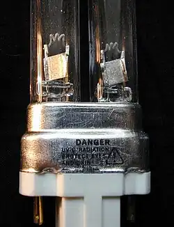 Close-up of the cathodes of a germicidal lamp (an essentially similar design that uses no fluorescent phosphor, allowing the electrodes to be seen)