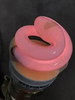 A fluorescent lamp tube is filled with a mix of argon, xenon, neon, or krypton, and mercury vapor. The pressure inside the lamp is around 0.3% of atmospheric pressure.[27] The partial pressure of the mercury vapor alone is about 0.8 Pa (8 millionths of atmospheric pressure), in a T12 40-watt lamp.[28] The inner surface of the lamp is coated with a fluorescent coating made of varying blends of metallic and rare-earth phosphor salts. The lamp's electrodes are typically made of coiled tungsten and are coated with a mixture of barium, strontium and calcium oxides to improve thermionic emission.
