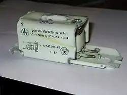 Electronic starters use a different method to preheat the cathodes.[37] They may be plug-in interchangeable with glow starters. They use a semiconductor switch and "soft start" the lamp by preheating the cathodes before applying a starting pulse which strikes the lamp first time without flickering; this dislodges a minimal amount of material from the cathodes during starting, giving longer lamp life.[36] This is claimed to prolong lamp life by a factor of typically 3 to 4 times for a lamp frequently switched on as in domestic use,[38] and to reduce the blackening of the ends of the lamp typical of fluorescent tubes. While the circuit is complex, the complexity is built into an integrated circuit chip. Electronic starters may be optimized for fast starting (typical start time of 0.3 seconds),[38][39] or for most reliable starting even at low temperatures and with low supply voltages, with a startup time of 2–4 seconds.[40] The faster-start units may produce audible noise during start-up.[41]