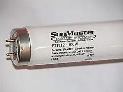 Typical F71T12 100 W G13 bi-pin lamp used in tanning beds. The (Hg) symbol indicates that this lamp contains mercury. In the US, this symbol is now required on all mercury-containing fluorescent lamps.[1]