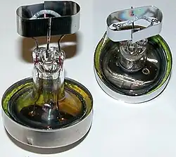Inside the lamp end of a preheat G13 lamp. In this lamp, the filament is surrounded by an oblong metal cathode shield, which helps reduce lamp end darkening.[2]