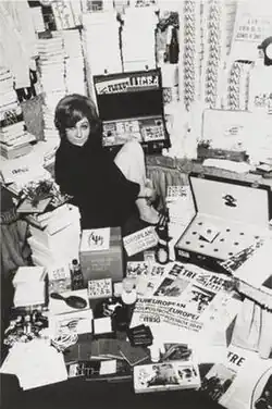 In 1969, Fluxus artist Joe Jones opened his JJ Music Store (aka Tone Deaf Music Store) at 18 North Moore Street, where he presented his repetitive drone music machines. He created there an installation in the window so that anyone could press numerous door buttons to play the noise music machines displayed there.[73] Jones also presented small musical installation performances there, alone or with other Fluxus artists, such as Yoko Ono and John Lennon,[74] among others. From April 18 to June 12, 1970, Ono and Lennon (aka Plastic Ono Band) presented a series of Fluxus art events and concerts there called GRAPEFRUIT FLUXBANQUET. It was promoted with a poster designed by Fluxus leader George Maciunas. Performances included Come Impersonating John Lennon & Yoko Ono, Grapefruit Banquet (April 11–17) by George Maciunas, Yoshimasa Wada, Nye Ffarrabas (formerly Bici Forbes and Bici Forbes Hendricks), Geoffrey Hendricks, and Robert Watts; Do It Yourself (April 11–17) by Yoko Ono; Tickets by John Lennon + Fluxagents (April 18–24) with Wada, Ben Vautier and Maciunas; Clinic by Yoko Ono + Hi Red Center (April 25-May 1); Blue Room by Yoko + Fluxmasterliars (May 2–8); Weight & Water by Yoko + Fluxfiremen (May 9–15); Capsule by Yoko + Flux Space Center (May 16–22) with Maciunas, Paul Sharits, George Brecht, Ay-O, Ono, Watts, John Cavanaugh; Portrait of John Lennon as a Young Cloud by Yoko + Everybody (May 23–29); The Store by Yoko + Fluxfactory (May 30-June 5), with Ono, Maciunas, Wada, Ay-O; and finally Examination by Yoko + Fluxschool (June 6–12) with Ono, Geoffrey Hendricks, Watts, Mieko Shiomi and Robert Filliou.[75]