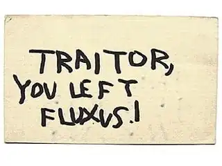 Maciunas and his friend Henry Flynt tried to get the Fluxus people to march around outside the circus with white cards that said Originale was bad. And they tried to say that the Fluxus people who were in the circus weren't Fluxus any more. That was silly, because it made a split. I thought it was funny, and so first I walked around with Maciunas and with Henry with a card, then I went inside and joined the circus; so both groups got angry with me. Oh well. Some people say that Fluxus died that day—I once thought so myself—but it turned out I was wrong.[62]