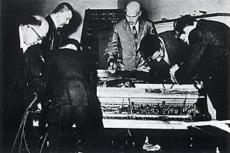 After returning to New York, Maciunas became reacquainted with Henry Flynt,[57] who encouraged members of Fluxus to take a more overtly political stance. One of the results of these discussions was to set up a picket line at the American premiere of Originale, a recent work by the German composer Karlheinz Stockhausen, 8 September 1964.[58] Stockhausen was deemed a 'Cultural Imperialist' by Maciunas and Flynt, while other members vehemently disagreed. The result was members of Fluxus, such as Nam June Paik and Jackson Mac Low, crossing a picket line made up of other members, including Ben Vautier and Takako Saito[59] who handed out leaflets denouncing Stockhausen as "a characteristic European-North American ruling-class Artist".[60] Dick Higgins participated in the picket, and then coolly joined the other performers inside;[61]