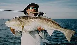 Saltwater fly fishing is typically done with heavier tackle than that which is used for freshwater trout fishing, both to handle the larger, more powerful fish, and to accommodate the casting of larger and heavier flies. Saltwater fly fishing typically employs the use of wet flies resembling baitfish, crabs, shrimp and other forage. However, saltwater fish can also be caught with poppers and other surface lure similar to those used for freshwater bass fishing, though much larger. Saltwater species sought and caught with fly tackle include: bonefish, redfish or red drum, permit, snook, spotted sea trout, tuna, dorado (mahi-mahi), sailfish, tarpon, striped bass, salmon, giant trevally and marlin. Offshore saltwater species are usually attracted to the fly by "chumming" with small baitfish, or "teasing" the fish to the boat by trolling a large hookless lure (Billfish are most often caught using this latter method).