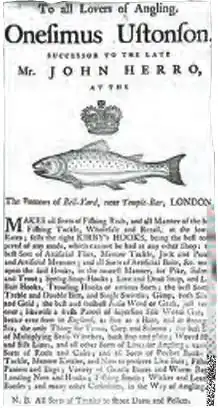 Some have credited Onesimus with the invention of the multiplying winch, although he was certainly the first to advertise its sale. Early multiplying reels were wide and had a small diameter, and their gears, made of brass, often wore down after extensive use. His earliest advertisement in the form of a trading card date from 1768 and was entitled To all lovers of angling. A full list of the tackles he sold included artificial flies, and 'the best sort of multiplying brass winches both stop and plain'. The commercialization of the industry came at a time of expanded interest in fishing as a recreational hobby for members of the aristocracy.[15]