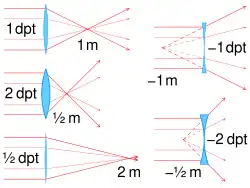 The optical power of a lens or curved mirror is a physical quantity equal to the reciprocal of the focal length, expressed in metres. A dioptre is its unit of measurement with dimension of reciprocal length, equivalent to one reciprocal metre, 1 dioptre = 1 m−1. For example, a 2-dioptre lens brings parallel rays of light to focus at 1⁄2 metre. A flat window has an optical power of zero dioptres, as it does not cause light to converge or diverge.[10]