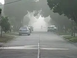 Fog is a visible aerosol consisting of tiny water droplets or ice crystals held in the air near the Earth's surface.[1][2] Fog can be considered a type of low-lying cloud usually resembling stratus and is heavily influenced by nearby bodies of water, topography, and wind conditions. In turn, fog affects many human activities, such as shipping, travel, and warfare.