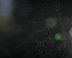 Minute droplets of water constitute this after-dark radiation fog, with an ambient temperature of −2 °C (28 °F). Their motion trails are captured as streaks.