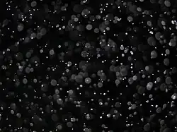 A close-up view of water droplets forming fog. Those outside the camera lens's depth of field appear as orbs.