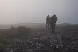 Fog forms when the difference between air temperature and dew point is less than 2.5 °C (4.5 °F).[6][7] Fog begins to form when water vapor condenses into tiny water droplets that are suspended in the air. Some examples of ways that water vapor is condensed include wind convergence into areas of upward motion;[8] precipitation or virga falling from above;[9] daytime heating evaporating water from the surface of oceans, water bodies, or wet land;[10] transpiration from plants;[11] cool or dry air moving over warmer water;[12] and lifting air over mountains.[13] Water vapor normally begins to condense on condensation nuclei such as dust, ice, and salt in order to form clouds.[14][15] Fog, like its elevated cousin stratus, is a stable cloud deck which tends to form when a cool, stable air mass is trapped underneath a warm air mass.[16]