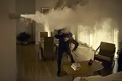 Artificial fog is man-made fog that is usually created by vaporizing a water- and glycol- or glycerine-based fluid. The fluid is injected into a heated metal block which evaporates quickly. The resulting pressure forces the vapor out of a vent. Upon coming into contact with cool outside air, the vapor condenses in microscopic droplets and appears as fog.[46] Such fog machines are commonly used for entertainment applications.[47]