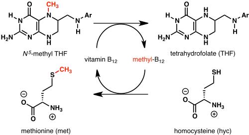 99. ^ Froese DS, Fowler B, Baumgartner MR (July 2019). "Vitamin B12, folate, and the methionine remethylation cycle-biochemistry, pathways, and regulation". Journal of Inherited Metabolic Disease. 42 (4): 673–685. doi:10.1002/jimd.12009. PMID 30693532.