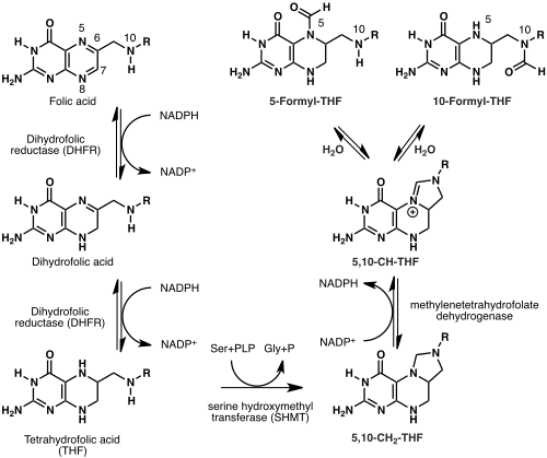 A one-carbon (1C) methyl group is added to tetrahydrofolate through the action of serine hydroxymethyltransferase (SHMT) to yield 5,10-methylenetetrahydrofolate (5,10-CH2-THF). This reaction also consumes serine and pyridoxal phosphate (PLP; vitamin B6) and produces glycine and pyridoxal.[85] A second enzyme, methylenetetrahydrofolate dehydrogenase (MTHFD2)[88] oxidizes 5,10-methylenetetrahydrofolate to an iminium cation which in turn is hydrolyzed to produce 5-formyl-THF and 10-formyl-THF.[85] This series of reactions using the β-carbon atom of serine as the carbon source provide the largest part of the one-carbon units available to the cell.[89]