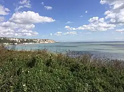 Folkestone is located where the southern edge of the North Downs escarpment meets the sea. In contrast to the white cliffs at Dover further to the east, the cliffs at Folkestone are composed of greensand belonging to the Folkestone Formation and gault clay. A small stream, Pent Brook, cuts through the cliffs at this point, and provided the original haven for fishermen and cross-channel boats. The cliffs are constantly under attack from the sea, and the original headlands, which once protected the port, long ago ceased to do so. Artificial protection, in the form of breakwaters and piers, have been necessary since the 17th century.[17]