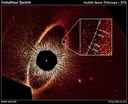 On November 13, 2008, astronomers announced an extrasolar planet candidate, orbiting just inside the outer debris ring. This was the first extrasolar orbiting object candidate to be directly imaged in visible light, captured by the Hubble Space Telescope.[49][50] The mass of the tentative planet, Fomalhaut b, was estimated to be less than three times the mass of Jupiter, and at least the mass of Neptune. However, M-band images taken from the MMT Observatory put strong limits on the existence of gas giants within 40 AU of the star,[51] and Spitzer Space Telescope imaging suggested that the object Fomalhaut b was more likely to be a dust cloud.[52] A later 2019 synthesis of new and existing direct observations of the object confirmed that it is expanding, losing brightness, has not enough mass to detectably perturb the outer ring while crossing it, and is probably a dispersing cloud of debris from a massive planetesimal collision on a hyperbolic orbit destined to leave the Fomalhaut A system.[19] Further 2022 observations with the James Webb Space Telescope in mid-infrared failed to resolve the object in the 25.5 μm MIRI wideband filter wavelength range, reported by the same team to be consistent with the previous result.[15]