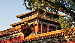 At the four corners of the wall (fortifications dating to the 15th and 18th centuries)[39] sit corner towers (E) with intricate roofs boasting 72 ridges, reproducing the Pavilion of Prince Teng and the Yellow Crane Pavilion as they appeared in Song dynasty paintings.[38] These towers are the most visible parts of the palace to people outside the walls, and much folklore is attached to them. According to one legend, artisans could not put a corner tower back together after it was dismantled for renovations in the early Qing dynasty, and it was only rebuilt after the intervention of master carpenter Lu Ban.[17]
