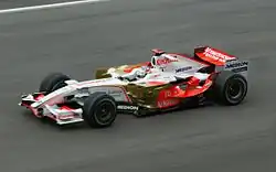 At the wet Chinese Grand Prix, Sutil almost secured Force India's first points, holding sixth place in front of Lewis Hamilton and Timo Glock with six laps remaining when aquaplaning led to the Force India car skidding off the road and crashing out of the race.[25] At the German Grand Prix, Sutil qualified in seventh place and battled for the points, reaching second at one point, before colliding with Kimi Räikkönen after exiting the pit lane and being forced to pit again to change a broken front wing. He finished 15th.[26]