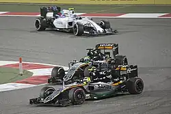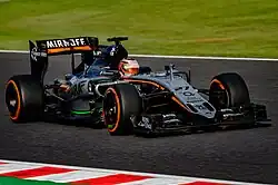 Force India missed the first pre-season test in Jerez, due to an unexplained setback in the development of the Force India VJM08. It was later revealed that Force India was, according to insider Ralf Bach, "facing financial collapse," and was "currently insolvent." He also suggested that the delays in the VJM08 were due to the fact that "important parts suppliers have not been paid".[74] Robert Fernley, deputy Team Principal, later admitted that the team was likely to miss all three pre-season tests, though he said that they might use the 2014 car to do some "driver and tyre work."[75] However, Force India's 2015 car finally broke cover when Hülkenberg hit the track on day two of the third and final test at Barcelona.[76] The car was an updated version of last year's challenger and was immediately reliable. They had a good start to the season with Hülkenberg finishing in a strong seventh place in the Australian Grand Prix.[77] However they struggled thereafter and did not score points until the Bahrain Grand Prix courtesy of an eighth-place finish by Pérez.[78] Both drivers delivered strong results in Monaco and Austria. The team later introduced a highly modified B-spec car at the 2015 British Grand Prix,[79] featuring two distinctive vents in the nose.[80] The car was a significant step forward from its predecessor, particularly in high-speed corners.[81] In Belgium, Pérez almost took the lead of the race on lap one and ultimately finished in a strong fifth place.[82] He followed up this drive with a sixth-place finish in Monza and seventh in Singapore. In September Sahara Force India lodged a formal complaint to the European Union against Formula One for breaching competition laws.[83] At the Russian Grand Prix, Pérez put Force India on the podium with a third-place finish, its first podium since the 2014 Bahrain Grand Prix.[84] Hülkenberg and Pérez finished seventh and eighth in Pérez' home race in Mexico City. This upturn in form helped Force India achieve their best placing of 5th place with 136 points in the Constructors' Championship, although scoring 19 fewer points than its predecessor.[85] This is a remarkable achievement considering the team's financial plight and their late preparations of the season by delaying the B spec version of their car. The Force India VJM08 for 2015 was suitable for the aerodynamic changes from the 2014 season.