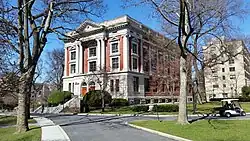 On June 21, 1904, the Regents of the University of the State of New York consented to allow the board of trustees to authorize the opening of a law school and a medical school.[43] St. John's College officially became Fordham University on March 7, 1907.[44] The name Fordham refers to the village of Fordham, in which the original Rose Hill campus is located. The village, in turn, drew its name from its location near a shallow crossing of the Bronx River ("ford by the hamlet"). When Fordham and several other Westchester County towns were consolidated into Bronx County at the turn of the twentieth century, the village became the borough's Fordham neighborhood. Still in existence today, it is just to the west of the Rose Hill campus.[45]