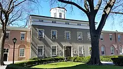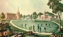 In 1840, St. Joseph's Seminary opened at Rose Hill.[23] The seminary was paired with St. John's College, which opened at Rose Hill with a student body of six on June 24, 1841, the feast day of Saint John the Baptist.[note 3] John McCloskey (later archbishop of New York and eventually the first American cardinal) was the school's first president, and the faculty were secular priests and lay instructors. The college presidency went through a succession of four diocesan priests in five years, including James Roosevelt Bayley, a distant cousin of Theodore and Franklin D. Roosevelt and a nephew of St. Elizabeth Ann Seton.[27] In 1845, the seminary church, Our Lady of Mercy, was built.[28] The same year, Hughes convinced several Jesuit priests from the St. Mary's College in Kentucky to staff St. John's.[29]