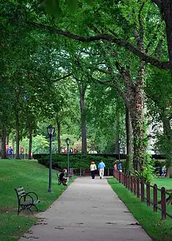 The Rose Hill campus, established in 1841 by Bishop John Hughes, is home to Fordham College at Rose Hill, the Gabelli School of Business, and a division of the School of Professional and Continuing Studies, as well as the Graduate Schools of Arts and Sciences and Religion and Religious Education. Situated on 85 acres (34.4 ha)[83] in the central Bronx, it is among the largest privately owned green spaces in New York City.[5] At one time spanning over 100 acres, much of the land for adjacent Bronx Park was acquired from the university with funds authorized by the 1884 New Parks Act intended to preserve lands that would soon become part of New York City,[57]: 166 [60][84] on the condition that it be used as a zoo and botanical garden.[85][86] Fordham students and staff have free admission to the garden grounds.[87] Rose Hill is on Fordham Road, just north of the Belmont neighborhood, described as the "real Little Italy of New York",[88] and immediately west of the Bronx Zoo and the New York Botanical Garden. The campus's Collegiate Gothic architecture,[89] expansive lawns, ivy-covered buildings, and cobblestone streets were featured by NBC News.[90]