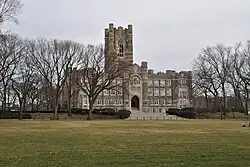 Fordham was founded as St. John's College in 1841 by the Irish-born coadjutor bishop (later archbishop) of the Diocese of New York, John Hughes.[22] It is the third-oldest university in the state of New York,[11] and the first Catholic institution of higher education in the northeastern United States.[10] In 1839, Hughes, then 42 years old, had purchased the 106-acre Rose Hill Manor farm in the village of Fordham, New York, for $29,750.[23] His intent was to establish St. Joseph's Seminary following the model of Mount Saint Mary's University, of which he was an alumnus.[24] "Rose Hill" was the name originally given to the site in 1787 by its owner, Robert Watts, a wealthy New York merchant, in honor of his family's ancestral home in Scotland.[25]