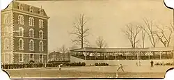 Fordham's baseball team, which played its first game on September 13, 1859,[37] made several contributions to the history of baseball in the nineteenth century, and played a key role in introducing the game to Cuba and Latin America. On November 3, 1859, Fordham played the first college baseball game with modern nine-man teams against the now-defunct St. Francis Xavier College in Manhattan.[23] Fordham won the game 33–11.[23] Steve Bellán, the first Cuban and Latin American to play major league baseball, learned the game while a student at Fordham from 1863 to 1868.[38] After playing for several American major league teams, he returned home and played in the first organized baseball game in Cuba on December 27, 1874.[38] Charles, Henry, and Frederick Zaldo, brothers from Havana who founded the Almendares Baseball Club, one of the three original Cuban baseball teams, also learned the game while attending Fordham from 1875 to 1878.[39]